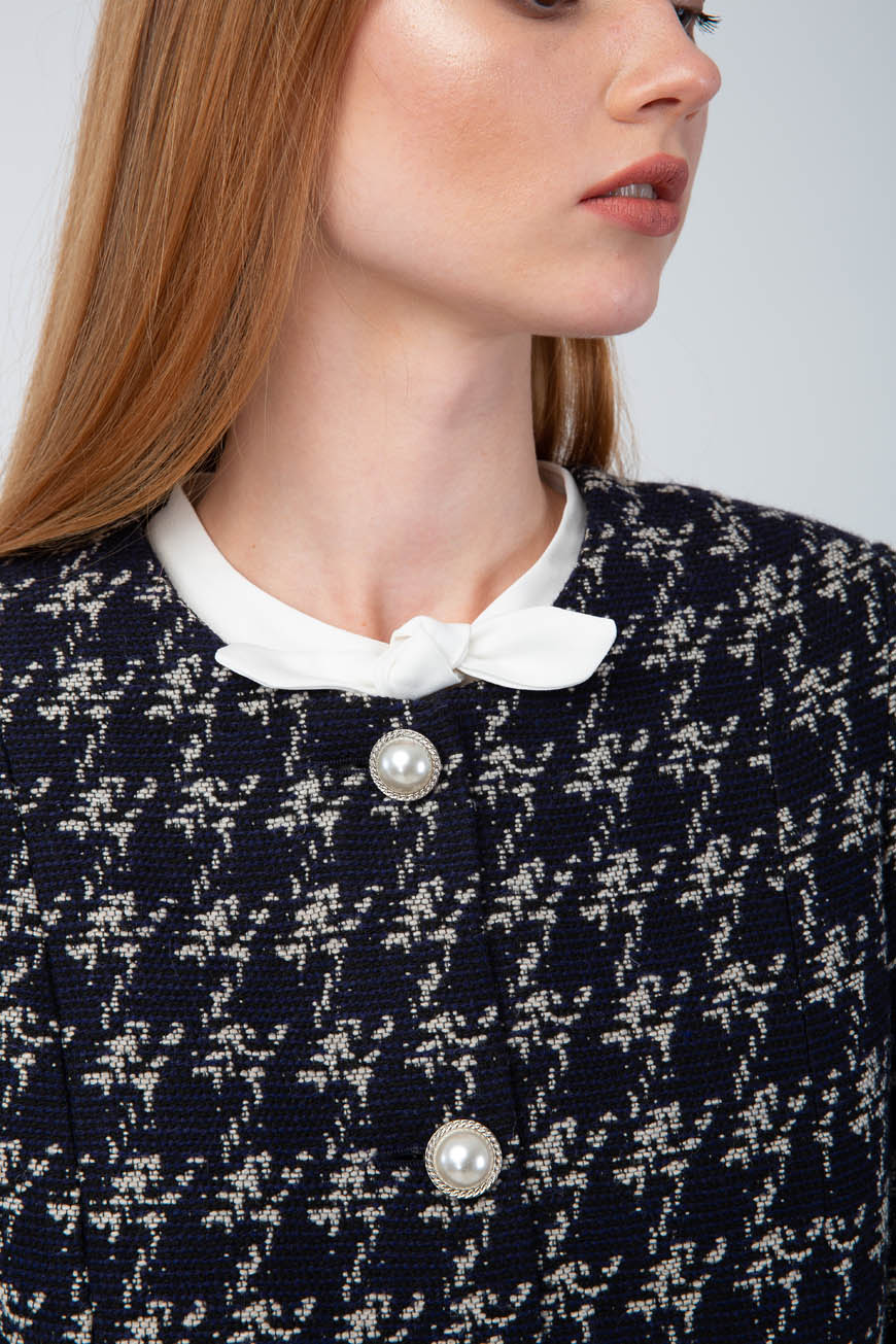 Σικ μπλούζα από βισκόζη με μακρύ μανίκι, στρόγγυλη λαιμόκοψη που καταλήγει σε μικρό διακοσμητικό φιόγκο από ζορζέτα. Πατιλέτα εμπρός κλείνει με 3 strass κουμπιά. Ο φιόγκος μπορεί να αφαιρεθεί.