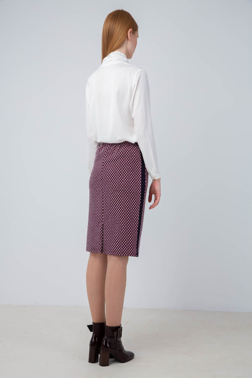 Μοντέρνα ευκολοφόρετη φούστα σε ίσια γραμμή από πλεκτό ύφασμα croix με κοντράστ φάσες στα πλαϊνά. Μήκος κάτω από το γόνατο. Μέση-λάστιχο.