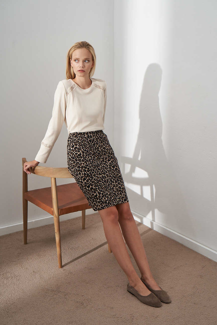 Trendy skirt with impressive leopard print. Fabulous sport chic morning look works perfectly as chic night outfit
