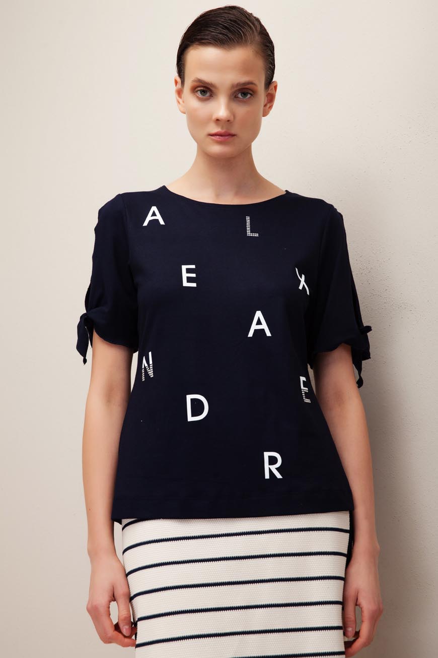 Round neckline knitted blouse made in viscose with company logo foil print. Short sleeves with side slit tied in a knot.