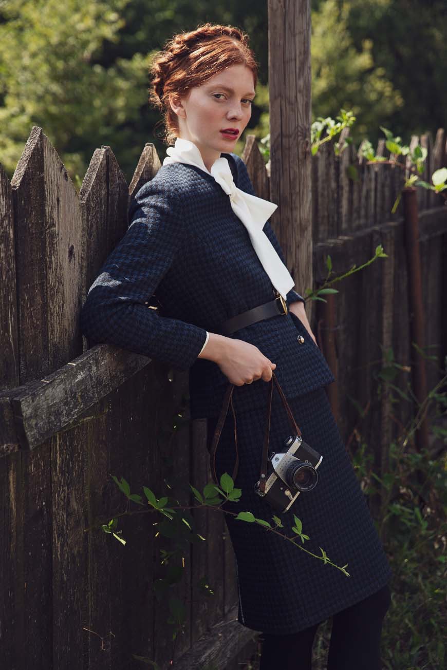 Chic pied de poule straight-line skirt. Back slit, knee length, back zip closure.