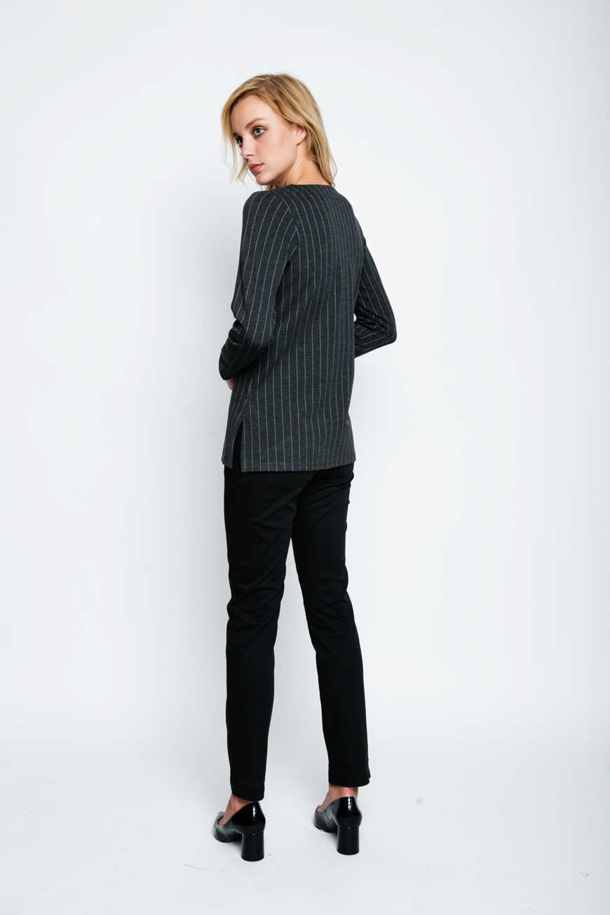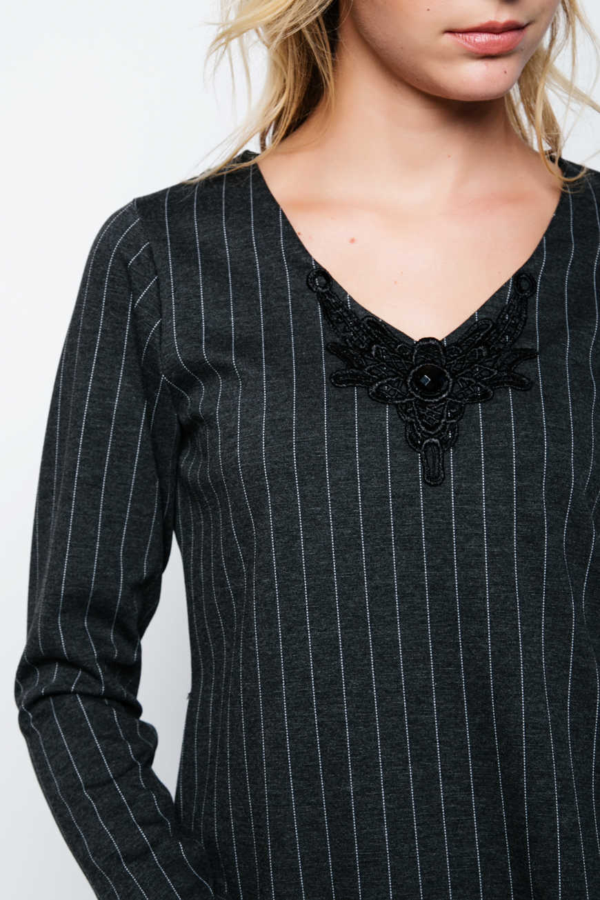 Ve neck pinstripe jacquard top. Crochet lace motif decorates the neckline. Loose fitting thigh length with side slits. Long sleeves.