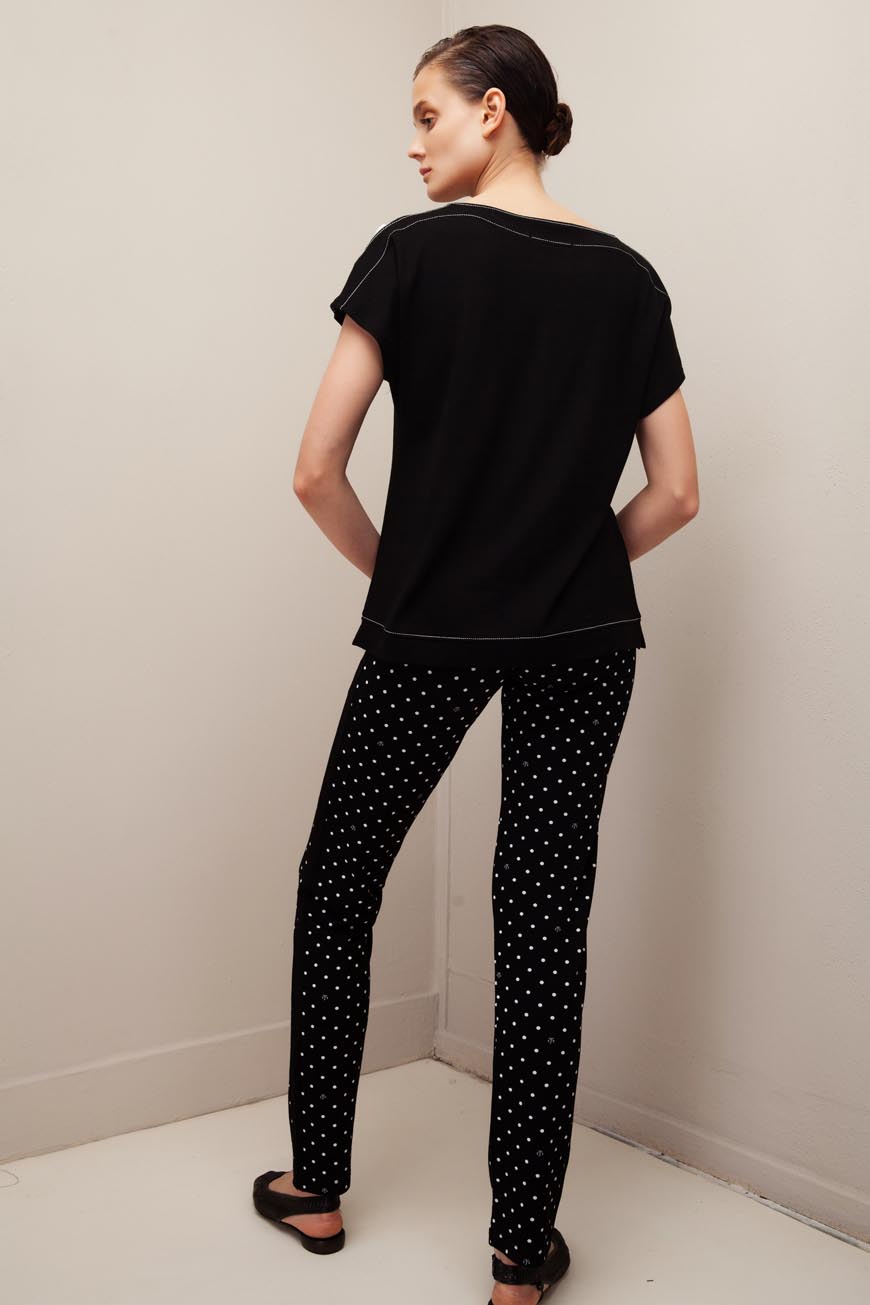 Polca dot print knitted trousers. Exclusive company print pattern. Contrast side bands. Slim line. Elastic waistband.