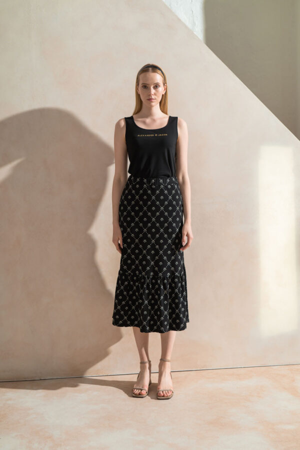 Lovely and romantic skirt made of elastic tweed fabric with lurex details and length above the knee.